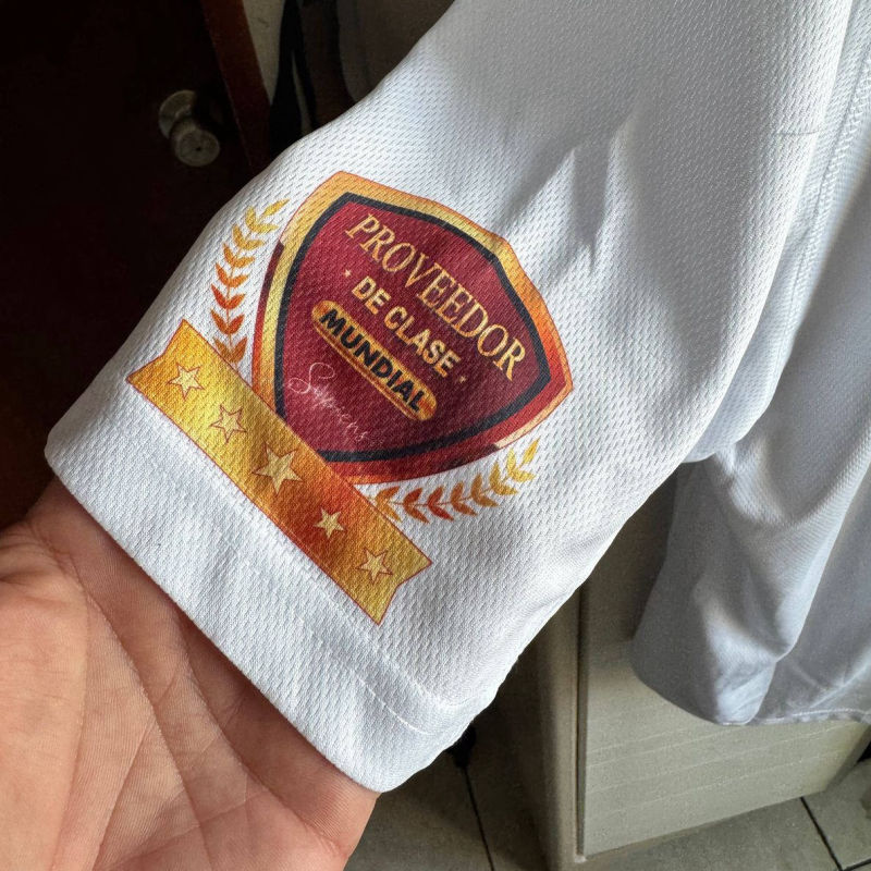 Logo grande en el dorso y logo pequeño en tetilla izquierda adelante.